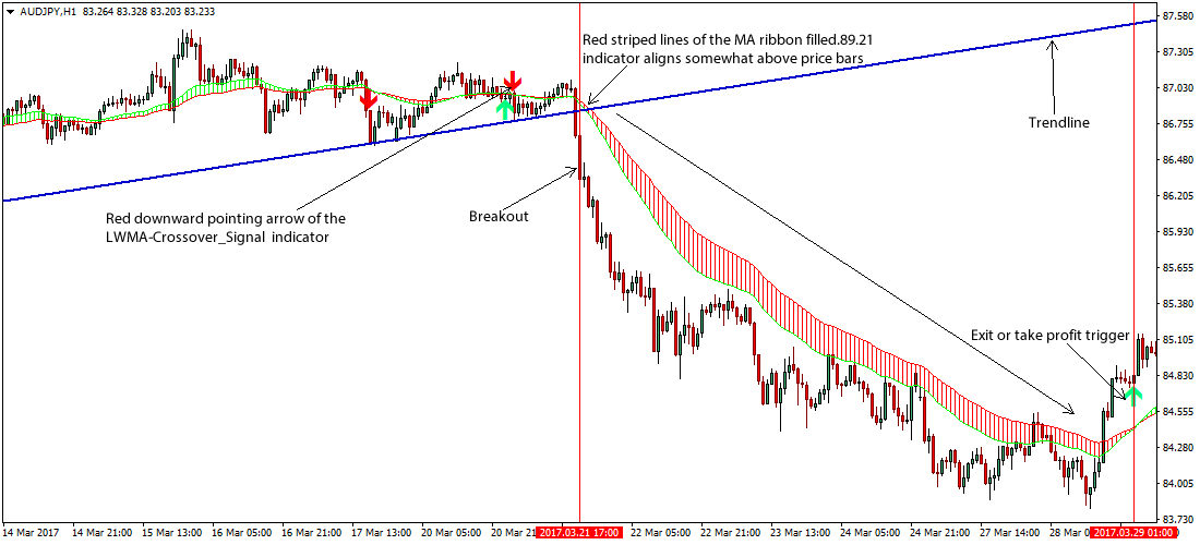 - If the striped red lines of the MA ribbon filled.89.21 custom indicator turns lime during a bearish signal, it is a call to exit or take profit without delay.