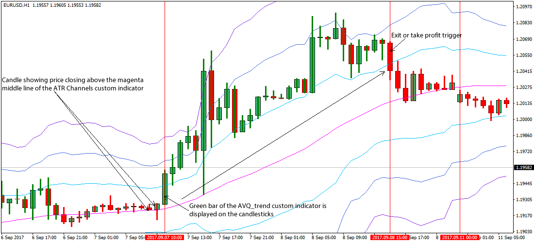 - If price closes above the middle magenta line of the ATR Channels custom indicator as seen on Fig. 1.0, price is said to be pushed higher i.e. a trigger to buy the designated currency pair.