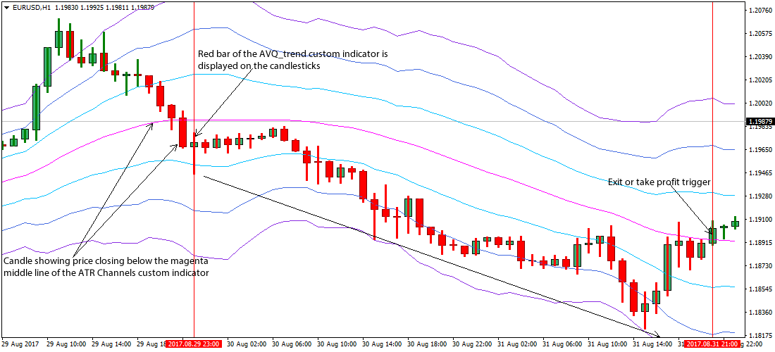 - If price closes below the middle magenta line of the ATR Channels custom indicator as depicted on Fig. 1.1, price is said to be pushed lower i.e. a signal to sell the currency pair of focus.