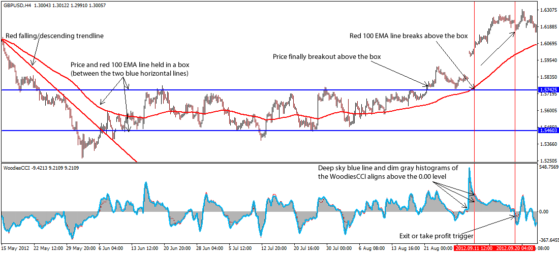 - If the 100 EMA indicator breakout above the box as seen on Fig. 1.0, it is a trigger to go long on the currency pair of focus.