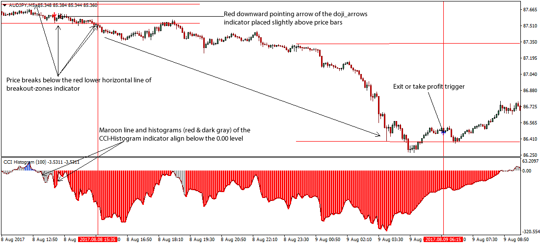 - If the maroon line and probably the dark gray histogram of the CCI-Histogram custom indicator break above the 0.00 level during a sell signal, an exit or take profit is in the offing.