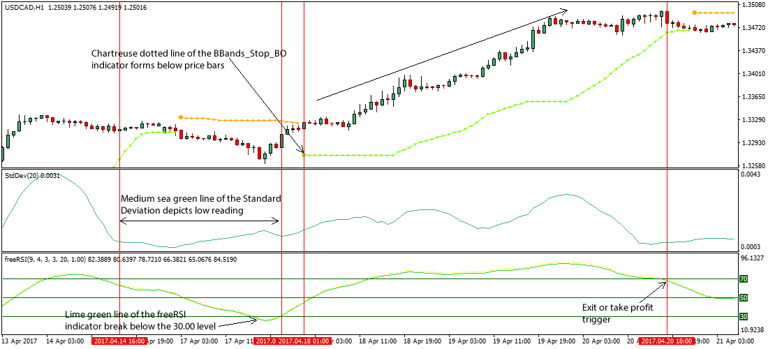 - If the BBands_Stop_BO custom indicator displays an orange dot somewhat above price bars during a buy signal, an exit or take profit is duly advised.