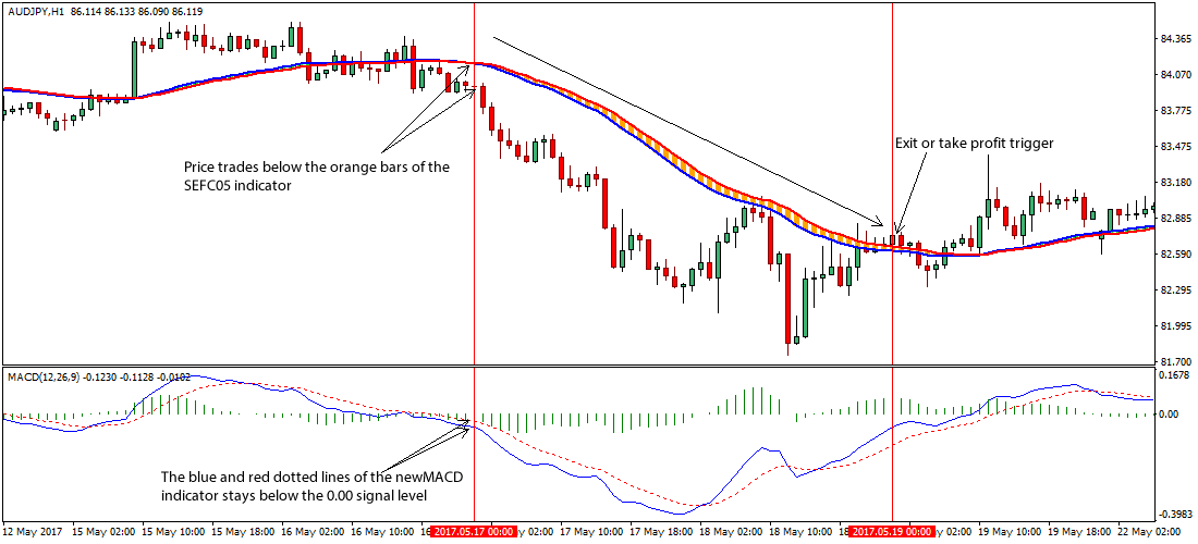 - If price opens and closes above the banded bars of the SEFC05 custom indicator during a bearish trend, price is said to be making a reversal from its earlier bearish stance, hence an exit or take profit will do.