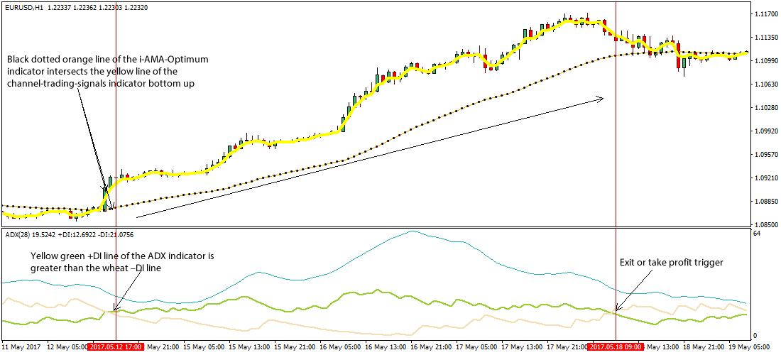 The three technical tools that makes up the strategy includes the i-AMA-Optimum for scanning trends, channel-trading-signals for checking up on volatility and the Average Directional Movement Index helps determine the strength of the trend in question.