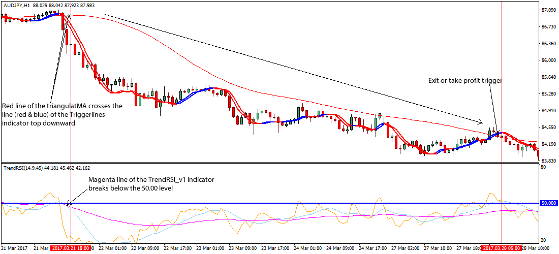 - If the magenta line of the TrendRSI_v1 custom indicator breaks above the 50.00 level during an ongoing bearish trend, an exit or take profit is advised.