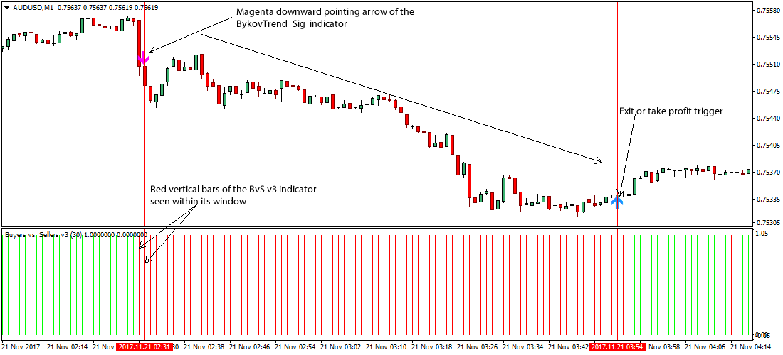 - If while a buy signal is ongoing, the BykovTrend_Sig.ex4 custom MT4 indicator displays a magenta downward pointing arrow that is aligned fairly above price bar, an exit or take profit is appropriate.